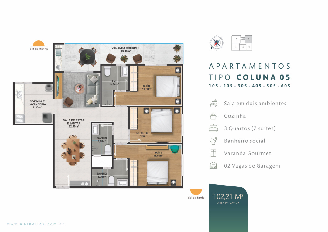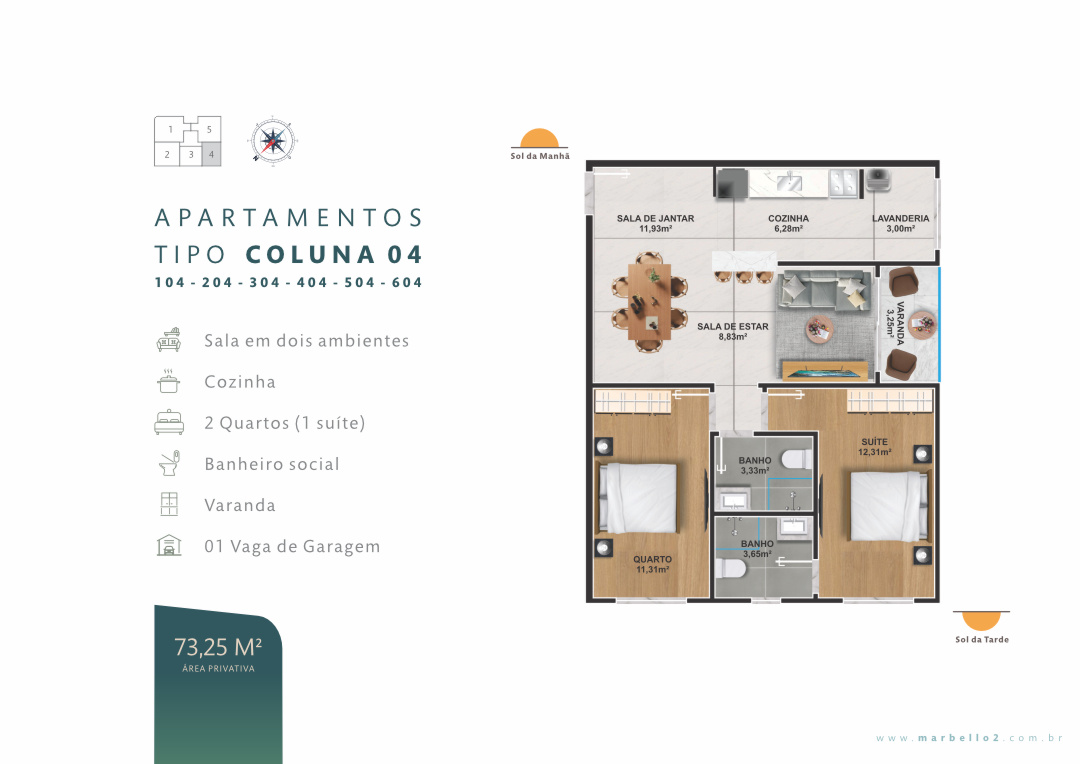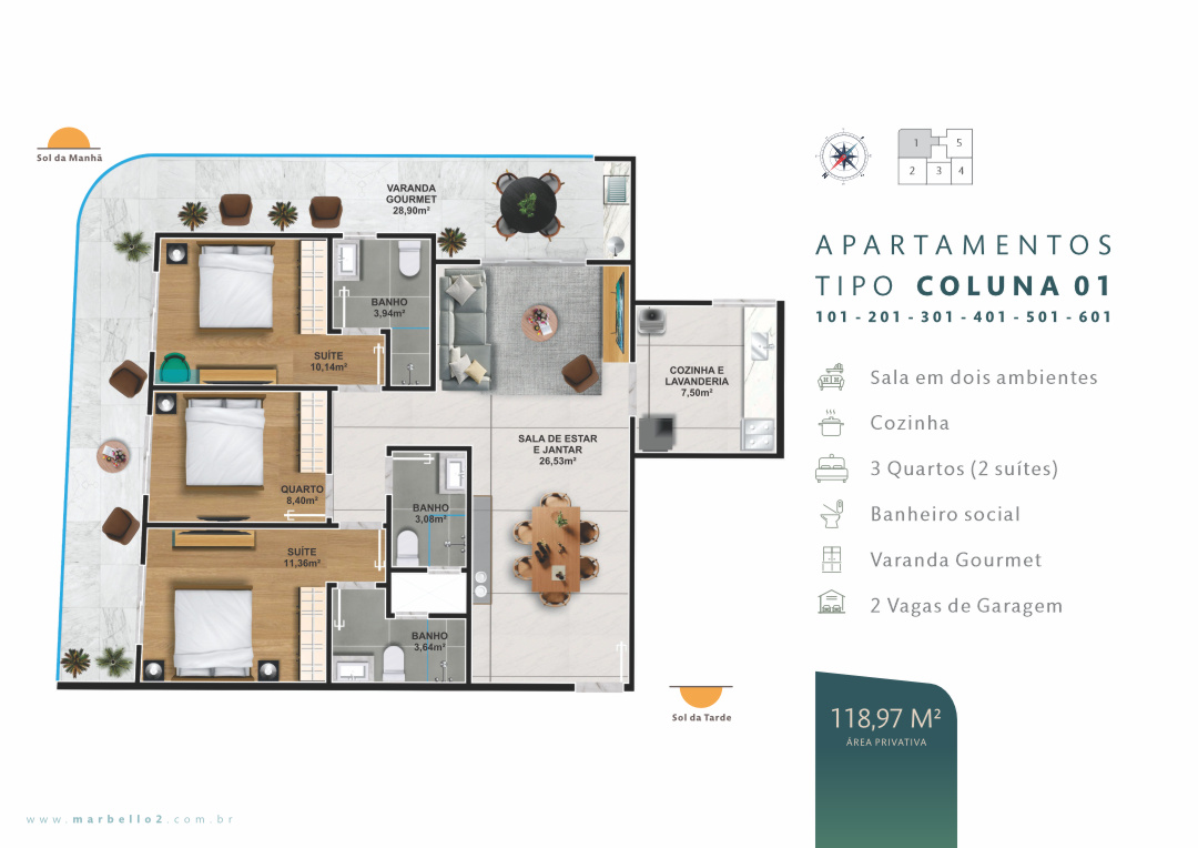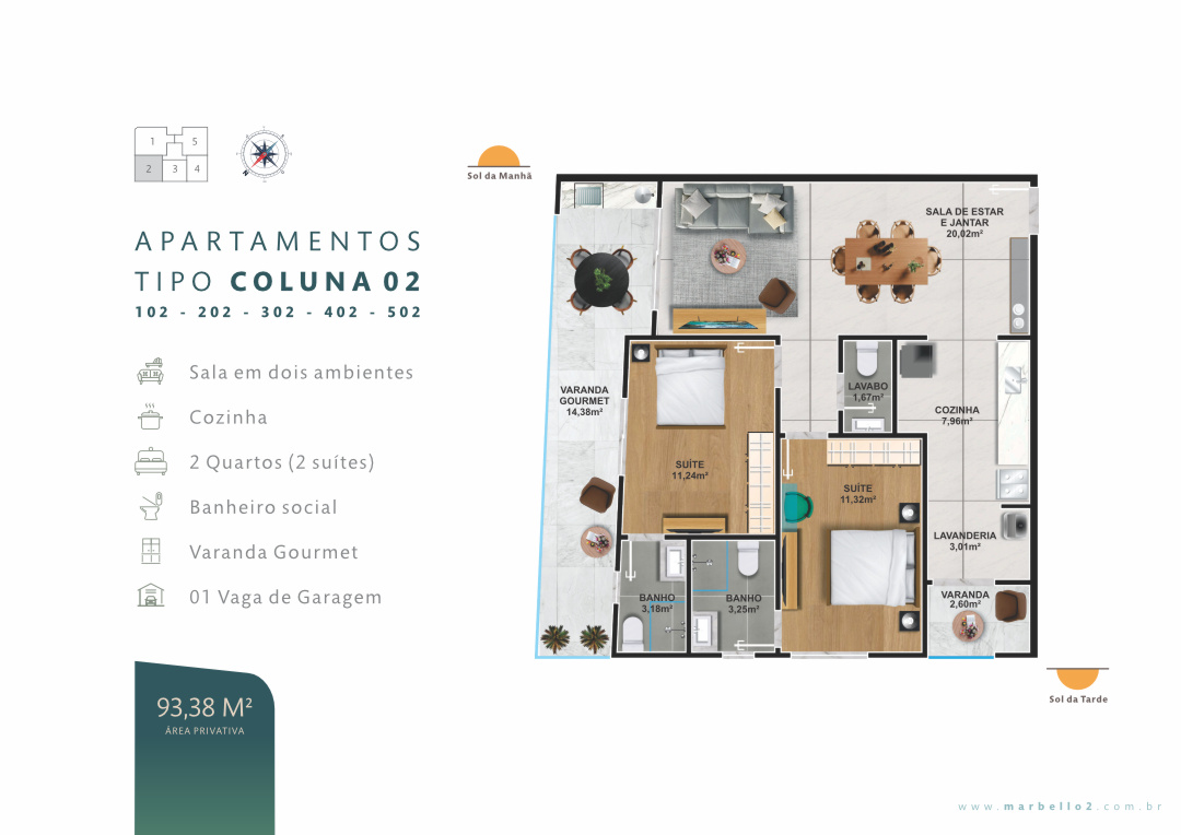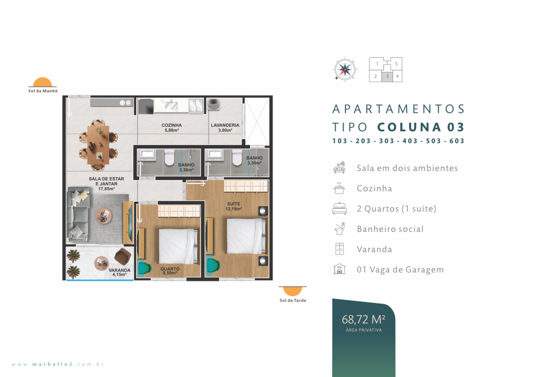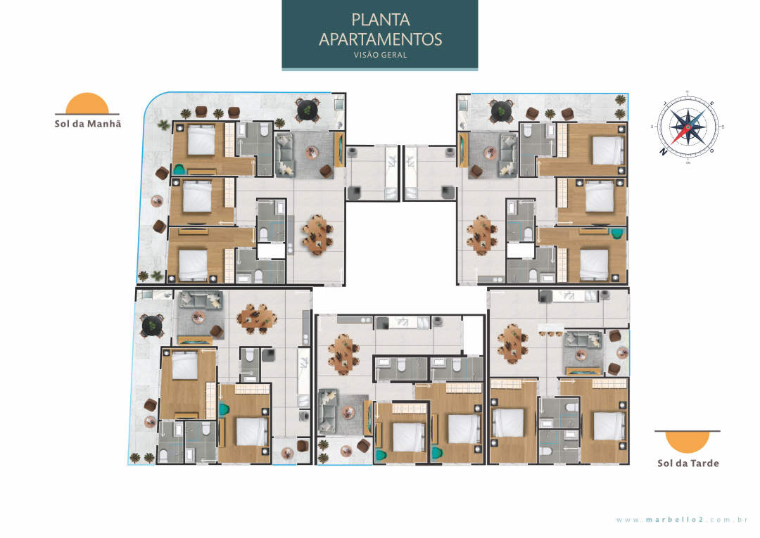 No Residencial Marbello II, cada apartamento é cuidadosamente projetado para proporcionar o máximo de conforto e funcionalidade. Com ambientes espaçosos e acabamentos de alta qualidade, aqui você encontrará o equilíbrio perfeito entre o sofisticado e a praticidade.